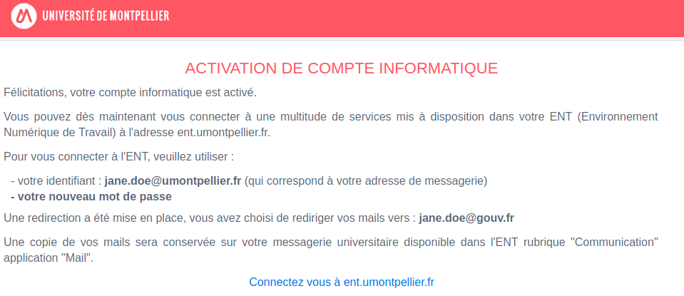 Une fois votre compte informatique créée, un mail sera envoyé sur votre adresse mail de secours. Ce mail contiendra votre identifiant et un lien vous permettant d’activer votre compte informatique.