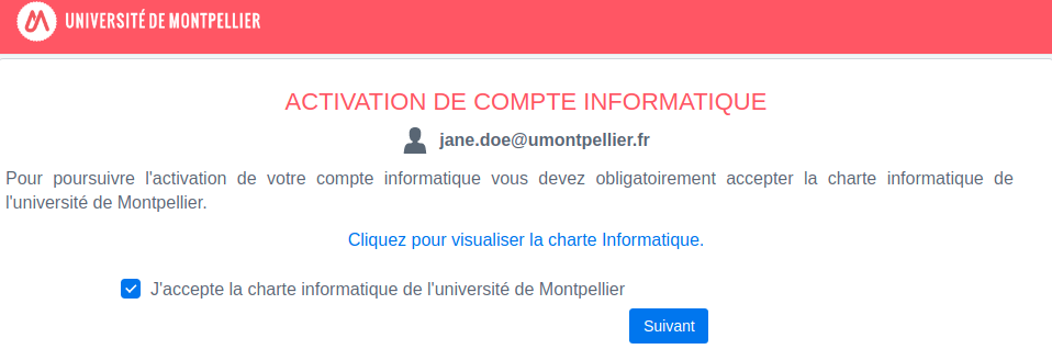 • Après avoir cliqué sur le lien d’activation (Étape 1), vous êtes dirigé vers la Charte d’utilisation des ressources informatiques. Prenez-en connaissance, cochez la case d’acceptation, puis cliquez sur « Suivant » pour continuer l’activation.