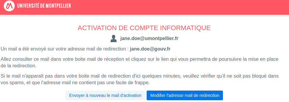 • Si vous avez saisi une adresse mail de redirection différente de l’adresse mail de secours, un mail contenant un lien sera envoyé sur cette adresse mail.