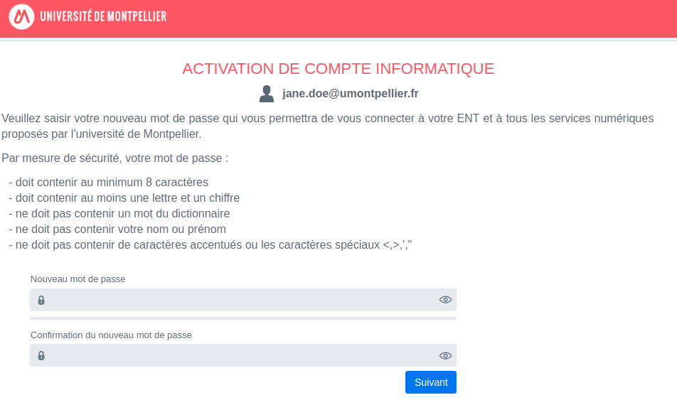 Procédure de Secours : Si ce délai de 24 heures est dépassé, rendez-vous sur l’ENT : https://ent.umontpellier.fr. Cliquez sur « 1ère connexion », puis renseignez votre adresse institutionnelle (). Un nouvel e-mail d’activation vous sera alors envoyé sur votre adresse de secours.