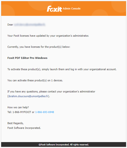 Après l’installation du logiciel, vous allez recevoir un en anglais intitulé « Your organization administrator has updated your Foxit licenses ». Exemple de mail reçu à l’assignation de la licence.