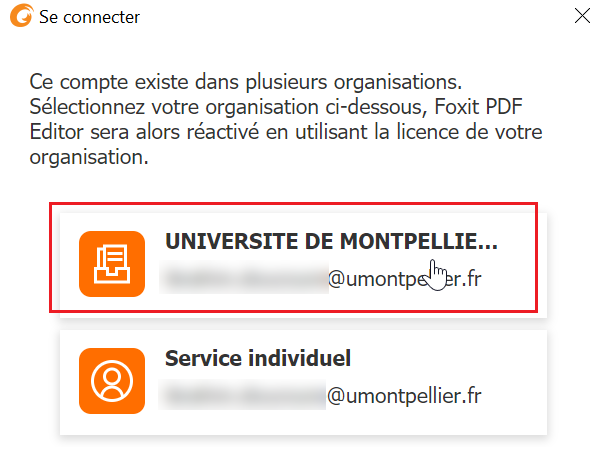 - Cliquez de nouveau sur le compte Université de Montpellier (Ignorez le compte le Service individuel) :