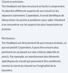 - Un accompagnement des apprenants dans la production de feedbacks grâce à une IA générative qui analyse leurs évaluations et leur suggère des améliorations.