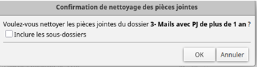 Vous pouvez alors lancer votre opération de nettoyage en cliquant sur « Supprimer les pièces jointes« . Confirmez en choisissant de traiter ou pas les sous-dossiers inclus dans le dossier sélectionné au départ.