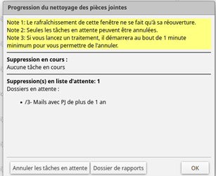 Pendant que se déroule l’opération de nettoyage, vous pouvez décider de stopper le processus. Pour cela faites un double-clic gauche sur « Progression nettoyage des pièces jointes » via le menu Zimlets.