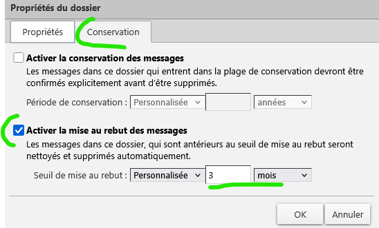 Pour chaque dossier de votre messagerie, vous pouvez définir une durée maximale de conservation des messages afin que ceux-ci ne s’accumulent pas indéfiniment.