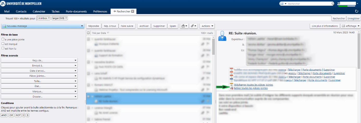 Zimbra affiche alors tous les e-mails de plus de 5 Mo.