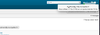 Pour connaître la taille actuelle de votre messagerie, positionnez le curseur de votre souris sur l’intitulé de votre compte, en haut à droite. Le pourcentage d’utilisation de votre quota ainsi que l’espace occupé s’affichent dans le pop-up qui apparait en dessous de votre nom.
