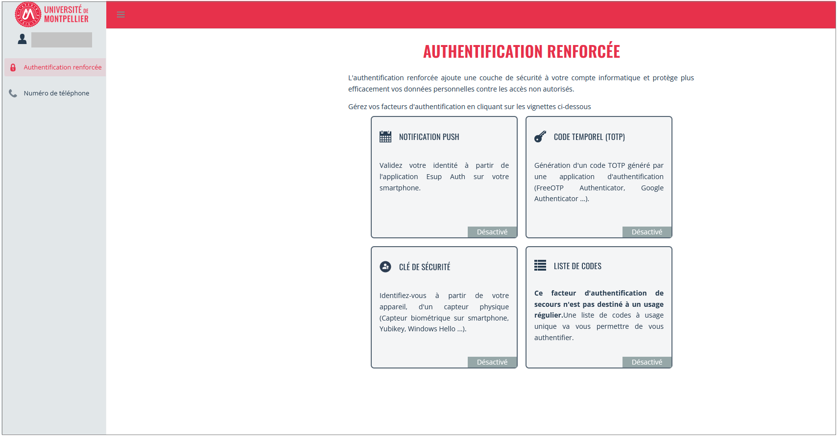 - En cliquant sur la brique « Gestion de l’authentification renforcée », la page « AUTHENTIFICATION RENFORCÉE » s’ouvre.