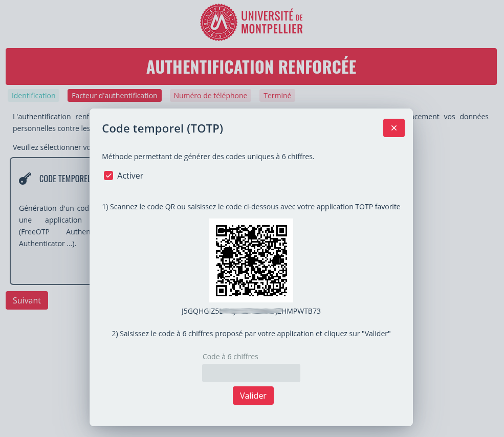 - Saisissez le code à 6 chiffres généré par l’application et cliquez sur « Valider »