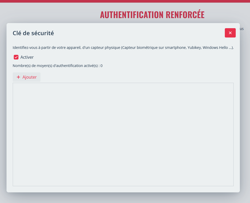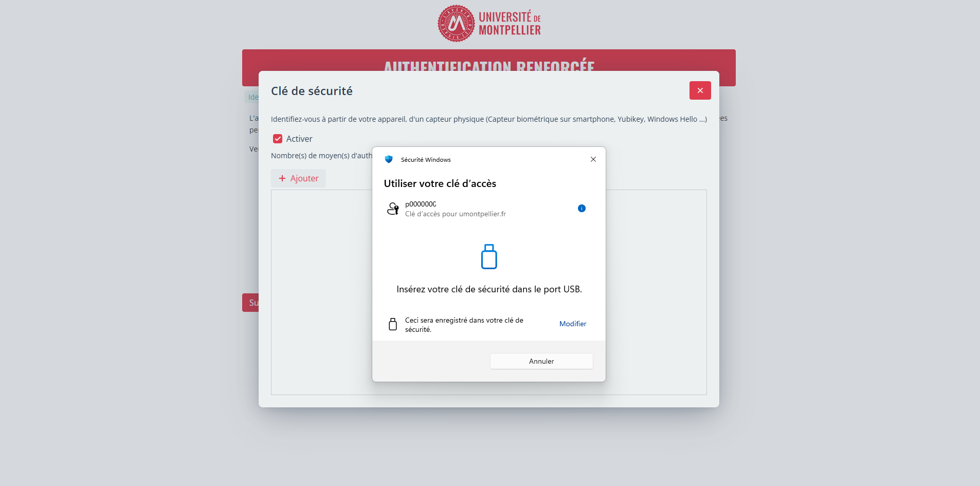 Si vous disposez d’une clé de sécurité compatible fido 2 ( ex. yubikey) vous pouvez l’utiliser comme moyen d’authentification renforcée.