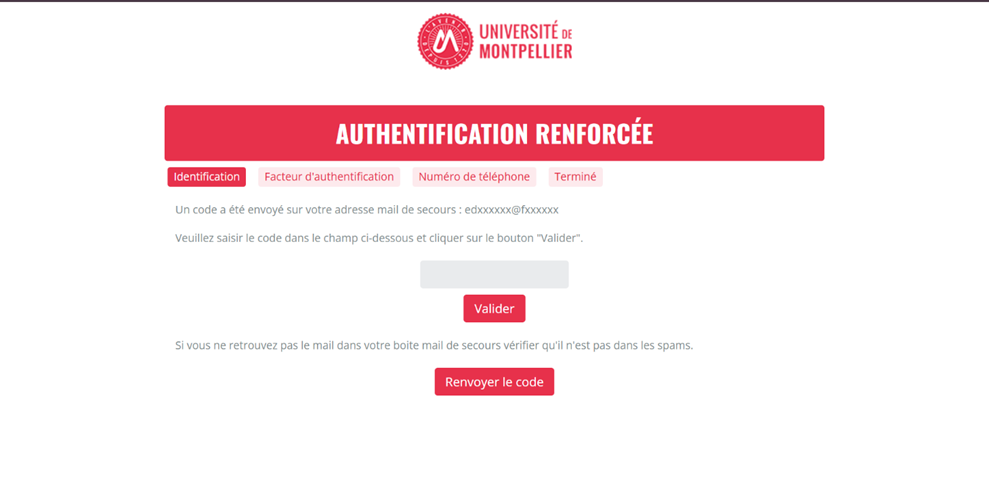 Dans ce cas, il faudra contacter le support de la DSIN pour récupérer votre accès. - Dans la même page, entrez le code reçu sur votre adresse mail de secours et validez.
