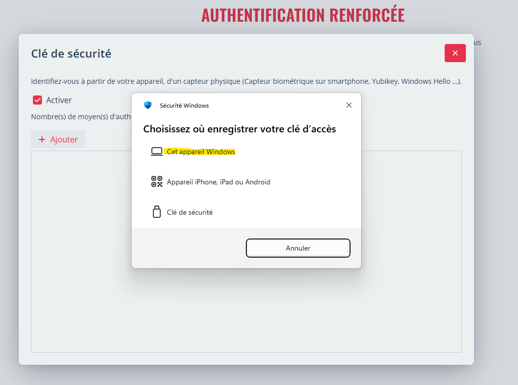 Si vous disposez d’une clé de sécurité compatible fido 2 ( ex. yubikey) vous pouvez l’utiliser comme moyen d’authentification renforcée.