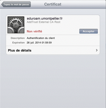 Si vos identifiants sont corrects, il vous sera alors demandé de valider le certificat « eduroam.umontpellier.fr ».